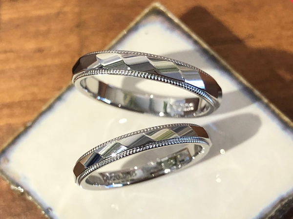 兵庫県明石市からご来店、泰助 様 & 彼女 様 / 光を受けて輝く表面のカットが美しいく個性を持たせた結婚指輪をご納品