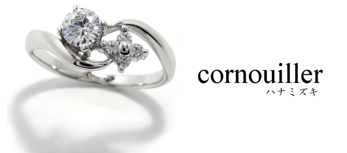 メインのダイヤモンドは輝きを活かす事を最優先に考えた究極のスタイルでセッティングされている。サイドには4つのメレダイヤで施された光輝くハナミズキが2人の門出を彩ってくれる。