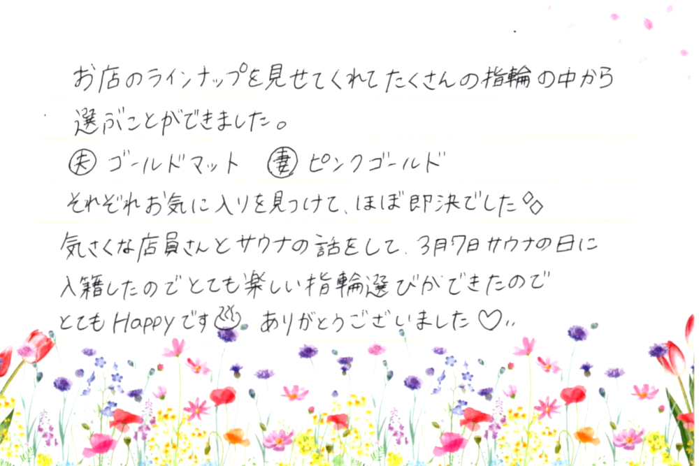 とても楽しい指輪選びができたのでとてもHappyです。ありがとうございました。