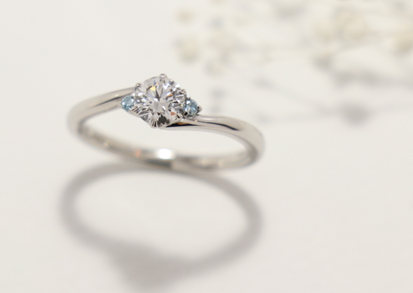 流れるようなS字のラインが指を細く長く綺麗に魅せてくれる。両サイドのブルーダイヤモンドの輝きは「いつまでも眺めていたいそんな永遠の輝き」を教えくれる。かわいさと美しさを兼ね備えたデザイン。